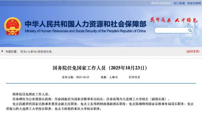 10月23日,人力资源社会保障部网站发布消息,国务院任免国家工作人员。任命谭权为公安部部长助理;任命段毅君为国家宗教事务局局长;任命高翔为大连理工大学校长(副部长级)。免去段毅君的国家民族事务委员会副2025-10-23