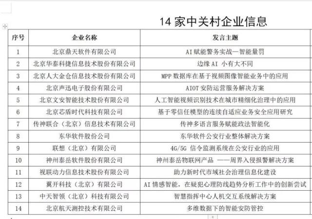 智能办案系统、语音识别、信息运维管理、智慧办公系统、大数据分析、生物特征识别、安检系统、视频监控等领域的中关村企业代表14家(约14人)
