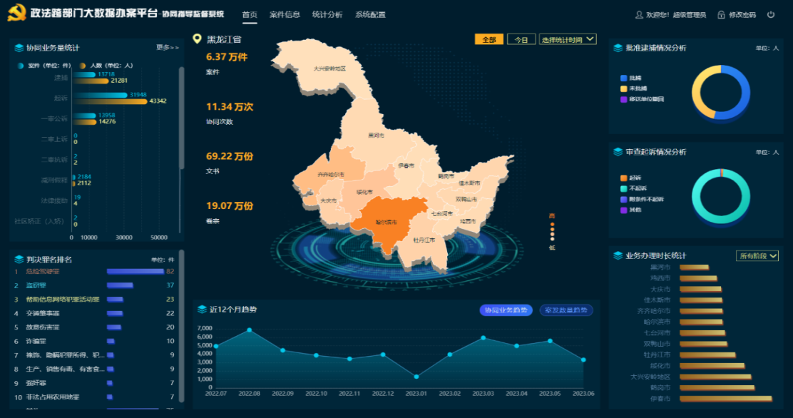 采用案件数据标签化留存方式,实现案件流转环节可查询、办案进程可监控、案件流转全程可追溯的一体化、通用化、标准化。直观展示政法各部门刑事案件网上流转情况,汇总、分析案件信息,呈现黑龙江省刑事案件发展态势,为龙江政法工作智能化监督与领导决策提供依据。