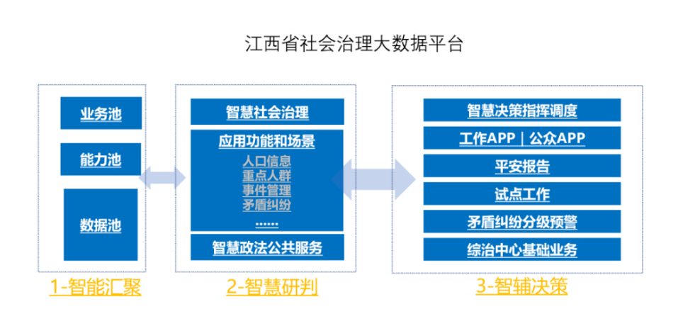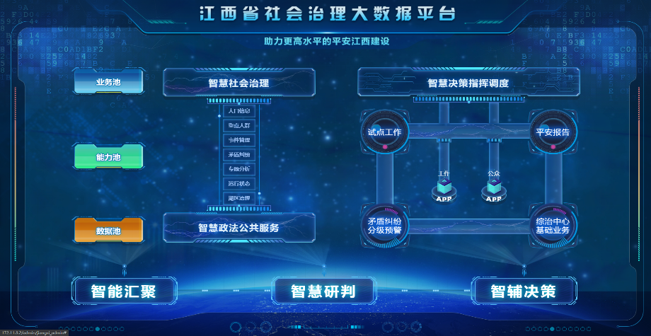 在本次江西省社会治理大数据平台的升级建设当中,为了强化省级平台对其 他业务领域、其他业务系统、其他地市或区县的能力支撑,打造 “智能汇聚”、 “智慧研判”和“智辅决策”三大体系,推动物联网、云计算、大数据、移动互 联网、区块链AI视频识别等先进技术与社会治理工作深度融合,并以业务驱动场景、业务驱 动技术、业务驱动应用为指导思想,围绕着“监管、服务、预警、决策”四个业 务域,创新场景开发功能,推进智能治理深度应用。进行了平台升级。平台升级后,汇聚大量重点人群及重点事件数据,平台运用大数据技术进行重点人群预警及重点矛盾纠纷事件预警。平台为我省的社会治理工作插上智慧的翅膀,业务工作不仅从线上流转,而且将变得更加智慧,标志着我省社会治理信息化进入 2.0 阶段,即社会治理大数据数智化时代。