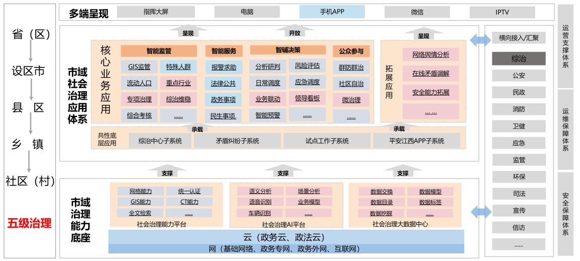 江西省社会治理大数据平台的建设主要是利用大数据、物联网、AI视频识别、5G、区块链等技术,以推进市域社会治理工作为方向 ,立足大数据、关注矛盾纠纷和平安报告,打造省、市、县、乡(街道)、村(社区)多级联动的社会治理大数据平台,平台以“智能汇聚、智慧研判、智辅决策”为三大应用体系, 提出“3 个能力平台,4 个基础应用,4 个功能建设方向,N 个拓展应用”的创 新平台建设思路。建成一个上下联通、信息共享、规范标准、安全、可靠、开放、 高效的具有全局意义的社会治理信息平台,逐步提高各级工作人员的社会治理能 力和水平,优化社会治理管理水平。