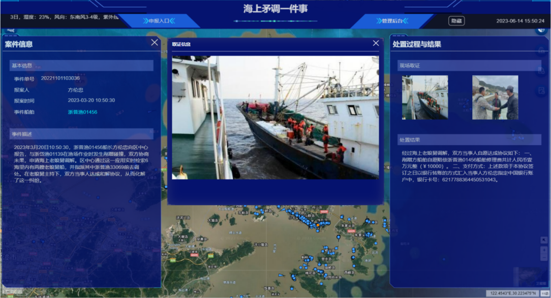 浙江是海洋大省,有效化解海上矛盾纠纷,对于维护海上平安、保障船民合法权益、促进海洋经济发展具有重要意义。作为“海上枫桥”源发地,舟山市普陀区以《法治浙江建设规划(2021—2025)》和《浙江省政法智能化发展“十四五”规划》为引领,围绕岛多、航道多、海况复杂的地域特点,聚焦海上纠纷预防预警难、海上取证难、部门协同难等痛点堵点,打造“海上枫桥”浙里矛调应用,创新海上矛盾纠纷全周期管理模式,为渔区平安稳定保驾护航。