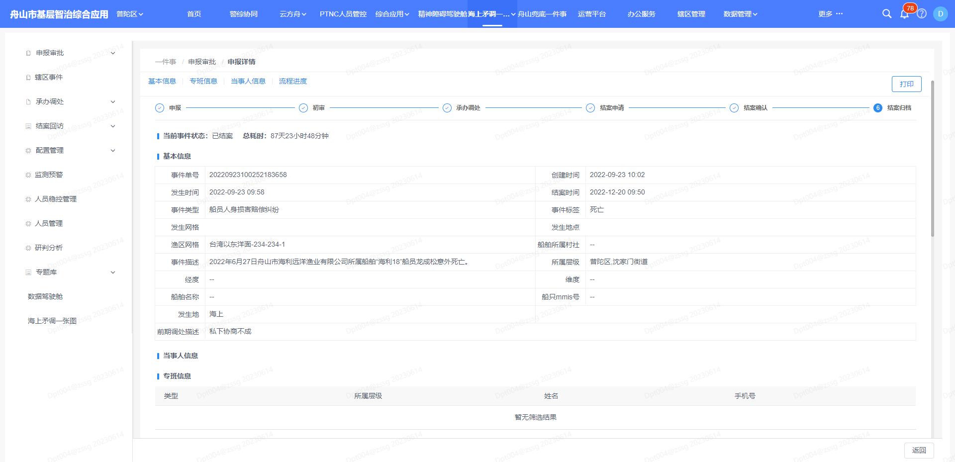 整合政法委、公安分局、司法局、海洋与渔业局、卫健局、社会治理中心、渔业互保协会等多方资源。群众进入“浙里办”“海上矛盾报事”界面填写事件描述、海上网格、发生时间、事件类型、事件标签、前期调处情况等相关事项,即可一键发布矛盾化解需求,由调处员在浙政钉端进行受理、指派、研判、调处全周期矛盾化解管理。建立调解专家库,对船舶碰撞损害、船只海上人身损害赔偿纠纷等疑难复杂事项,应用支持一键组建专班和手动定向指派,主办单位可根据需求生成事件的协同交办、化解举措、处置力量等组合配置。