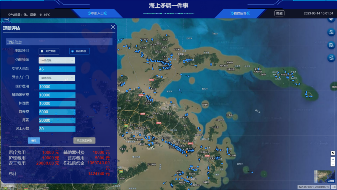 汇集身份信息、事实认定、责任判定、船(财)损鉴定等各方基础数据,一屏动态展示全区海上矛盾各项数据的分类统计、趋势分析、区域分布实情,为调解提供基础信息保障。将全区分为 10 个区域,根据区域纠纷事项量、重点纠纷事项调处化解情况以及涉事对象分布等维度,生成区域纠纷指数,形成红黄蓝三色指数等级。红色为最高级,实时处置干预;黄色为重要级,重点处理关注;蓝色为关注级,可通过驾驶舱进行持续自动关注。定期生成系统运行报告,为责任部门提供参考。