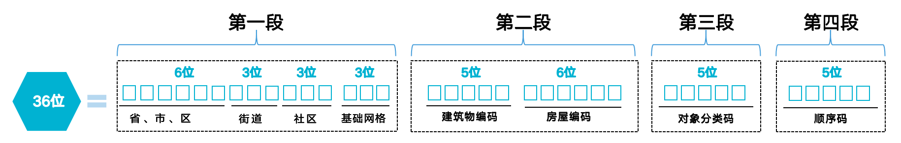 将城市公共基础要素分为境界与政区、建筑房屋、市政设施、道路交通、物联传感、管线、水系共七个大类。将城市公共基础要素统一标识编码分为四段,第一段编码表示基础网格及以上的政区管理单元代码(15位),采用属地管理;第二段编码表示建筑物和房屋编码(11位);第三段编码表示城市公共基础要素的对象分类码(5位);第四段编码采用对象顺序号(5位),共36位。