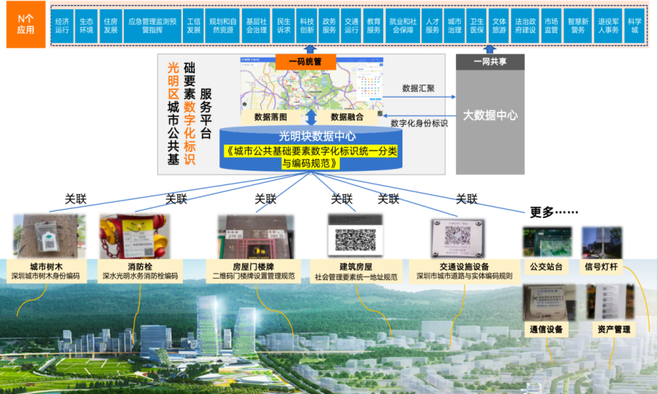 2022年8月,光明区正式启动数字化标识服务工作,试点探索为交通、市政等领域的城市管理对象分配唯一数字标识,实现城市公共基础要素强关联到“房”,弱关联到“格”,借助统一分类编码标识体系解决跨层级、跨地域、跨系统、跨部门、跨业务的数据落图与关联融合,提高“光明数字源力场”数据服务供给水平。
