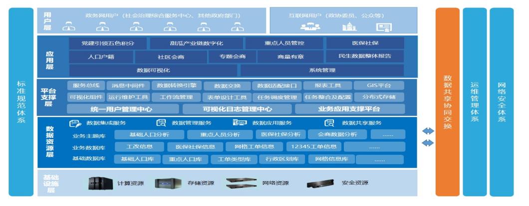 应用层:作为平台的核心业务应用支撑,提供党建引领五色积分、甜瓜产业链数字化、重点人员管控、医保社保、人口户籍、社区会商、专题会商等核心应用功能。