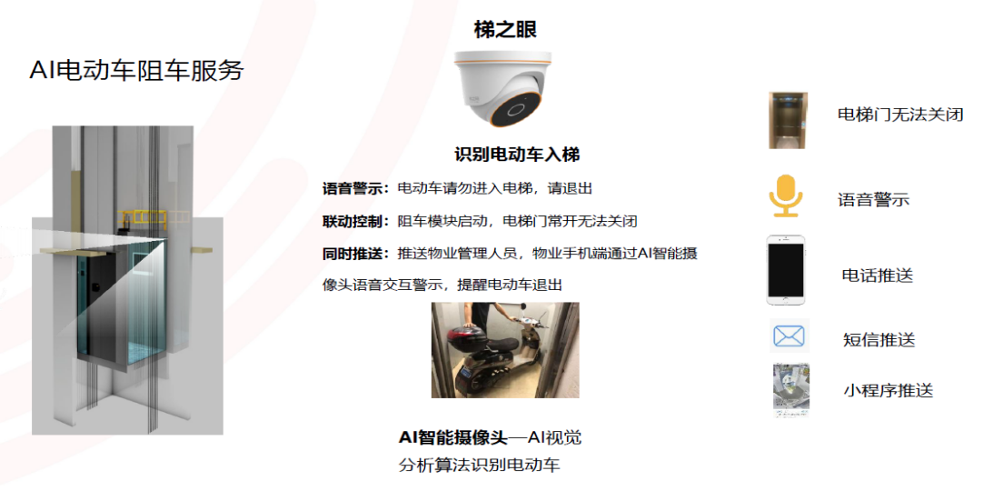 电瓶车进轿厢(报警)并阻止,长时问阻门报警。解决方案:①摄像头通过AI识别电动车,并语音告警提示禁止入梯;②通过阻车模块阻止电梯关门;③告警信息推送至物业管理人员,进行远程语音劝阻。
