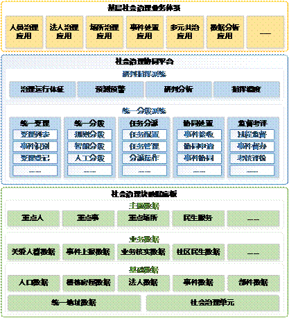 以推动“社会治理社会化、法治化、智能化、专业化”为目标,以社会治理数据体系为基础,以基层社会治理应用为抓手,探索建立市、区、街道、社区的社会治理新模式。通过建设区级、街道的工作平台,夯实街道、社区工作平台,创新执法模式,畅通社会公众参与社会治理渠道,打造多级政府、社会和公众人人参与、人人尽责的社会治理体系,全面提升基层治理智能化和精细化水平。