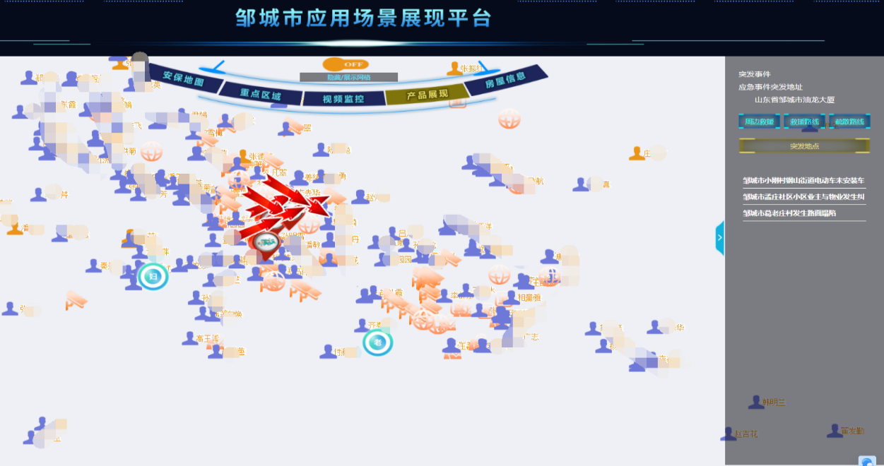 基于产品特有的2.5D地图,将综合调度指挥、综合治理数据、“雪亮”工程与“天网”工程视频监控汇聚于一体。当发生紧急事件时。在2.5D地图上可以准确定位应急事件发生地点,以及周边网格员、救援力量、重点场所、视频监控、应急物资等所在位置,指挥中心采用“一二三四五”应急指挥形式,一通过监控查看现场情况,及时做出应急方案,二是通过音视频通话一体化调度周边消防、应急、公安等部门资源进行应急联动,第一时间组织救援力量赶往现场处置,将应急情况进行一体化联动处理;三通过系统模拟给出的最佳救援路线和疏散路线,进行路线指挥调度,在救援过程中,随时可以与救援人员进行音视频连线,预判事件进一步走势;四是调度周边网格员前往现场,通过和网格员实时音视频调度全方位查看事件的发展动态,随时根据现场动态调整应急方案,进行应急联动指挥;四连线现场的网格员组织疏散聚集群众,最大限度保障群众生命安全,强化应急处突能力,夯实建设成果。