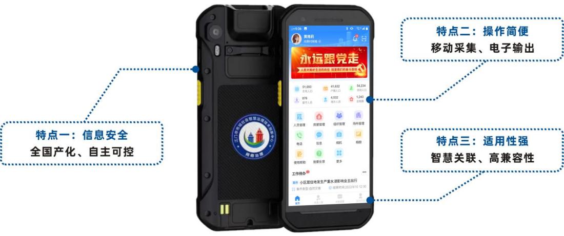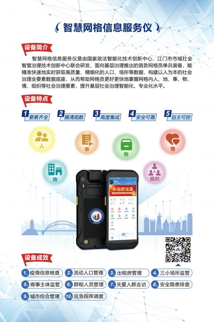 智慧网格信息服务仪是由国家政法智能化技术创新中心(航天科工网络信息发展有限公司)、江门市市域社会智慧治理技术创新中心联合研发,为解决社会治理基层网格工作中信息采集繁琐、采集强度大、实时有效性差、网格信息化手段不丰富、应用集成度低、安全性差等问题,面向基层治理推出的首款网格员单兵装备,能精准快速地实时获取高质量、精细化的人口、场所等数据,以人口数据为核心,以为民服务为宗旨,获得人与场所、企业、房屋等数据的关联,构建以人为本的社会治理全要素数据底座,从而帮助网格员更好更快地掌握网格内人、地、事、物、情、组织等社会治理要素,提供网格管理“一站式”移动平台,高质量服务基层社会治理,提升基层社会治理智能化、专业化水平。