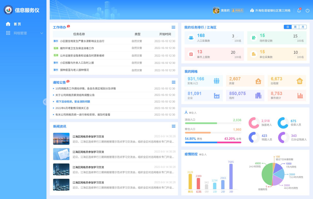 智慧网格信息服务仪基于智能化移动终端设备,采用嵌入式开发技术,集成身份证核验、健康码扫描、地理(GIS)信息、体温监测、核酸核验、地图定位巡查等多项先进的信息化技术,实现市域社会治理工作中的疫情防控、信息核验、事件上报、知识学习等业务场景的管理,快速推进市域社会治理的全天候、智慧化进程。借助核采仪目前已累计核采用户数据24.8万条,场所数据3.6万条。在疫情防控阶段,对江门市江海区全区和台山市全市140万人口以及外来人员数据实现动态管控。同时,信息服务仪的人口、场所、出租屋、法人采集核验和数据关联功能,为社会治理场景建设搭建基础数据基础。