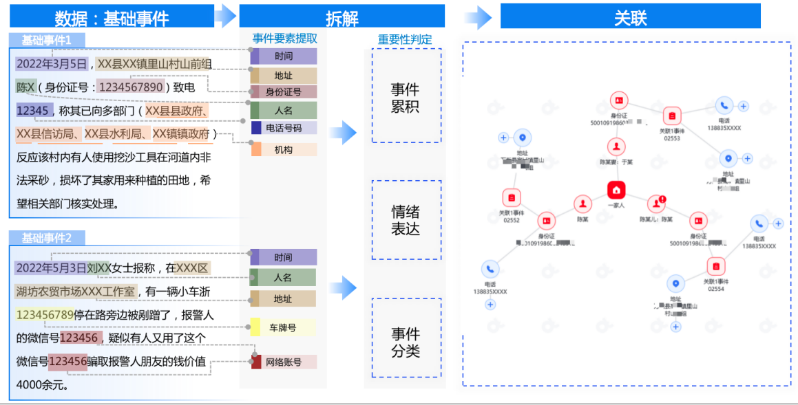 安领文本解析引擎背后的大模型算法可以准确的判断基础事件描述中的人物信息、联系信息、地址信息、组织信息、时间信息,并精准形成对应关联。支持模糊口语表述,容错率高;同时还可以对事件描述的情绪表达进行判断。目前在训练的2.0版本,还可以对事件主题进行准确总结以及对矛盾的升级趋势做逻辑推演。
