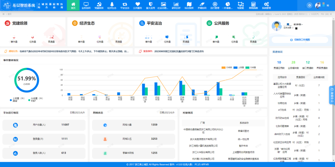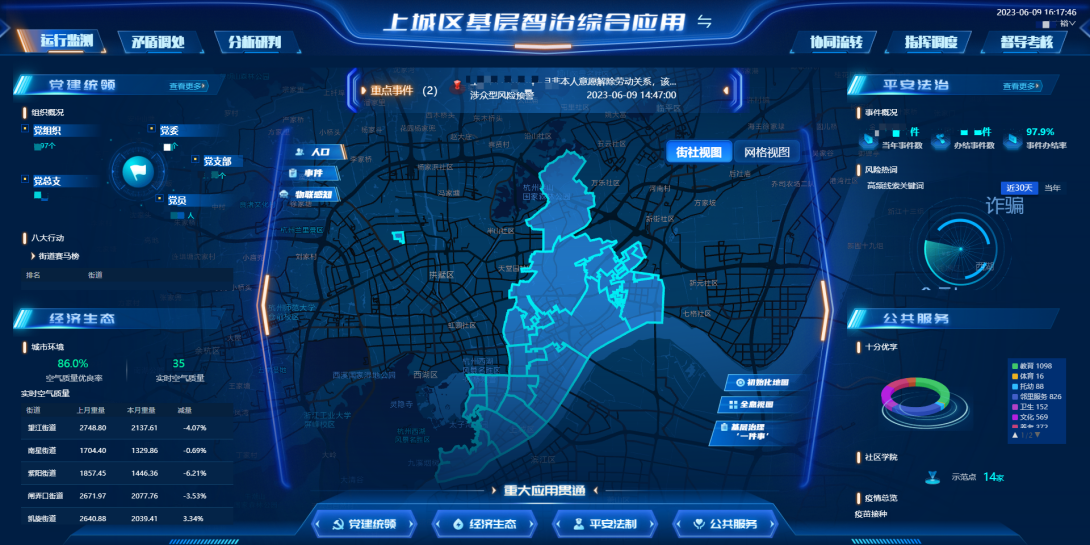 (二)在“融”字上做文章,确保应用贯通“实”。上城区基层智治综合应用在贯通“社区矫正应用”“浙江e行在线”“防汛防台在线”“森林防灭火在线”等省级重大应用的基础上,积极推动区级特色应用的集成工作。区级驾驶舱融合四条跑道、六大功能,分步建设指挥中心、感知中心、算法中心,实现基层运行“一屏统揽”,网格事项“一库感知”、预测预警“实时透出”,街道驾驶舱采用区级统建模板,界面统一、功能集成,集约高效,结合个性化街情,综合集成自建特色应用,湖滨街道的智慧商圈、四季青街道的智慧楼宇、彭埠街道的智慧工地、红色十二时辰等应用有效融合,实现共建共治共享。