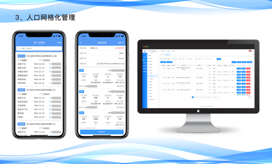 (三)人口管理网格化。人口管理网格化作为平安建设的基础功能,将本村常住户口和外来户口在村委会PC端实行智能管控,授权网格员在手机APP上即可实施管理。PC内网后端能智能分析人口信息,包括人口数量和结构、疫情防控信息等详细信息,便捷高效,快速精准。