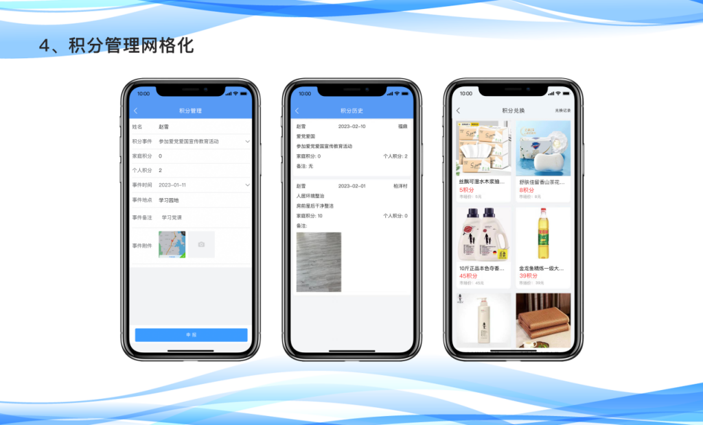 (四)积分管理网格化。户户参与积分管理,共建文明乡村。对村民参与爱国爱党、遵纪守法、乡村建设、人居环境整治、家庭美德、公益美德、移风易俗、产业致富等一级目录涵盖的子项目进行积分管理,鼓励村民做有利于平安乡村建设的事。网格员或村民自己可以在APP或小程序上申报积分,网格长后台审核后生成积分。村民和网格员都可以轻松填报、管理个人积分、家庭积分台账,村民在积分管理平台“个人中心”查看个人历史积分、家庭积分、兑换积分等,可以用积分在APP商城兑换自己喜欢的商品。通过积分管理系统,提高村民参与度,促进乡风文明,小积分兑换“大文明”。