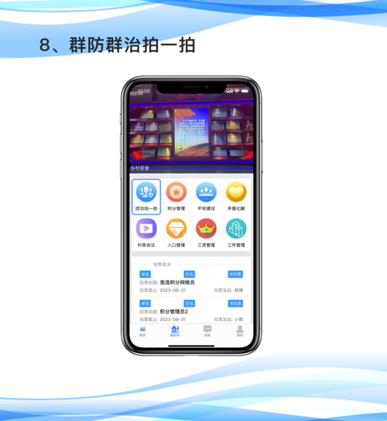 系统主要是在用户手机端应用“平安屯”小程序或APP,宣传平安建设和“矛盾化解”、“议事平台”、“委员代表”、“人口网格”、“积分管理”、“公益法援”、“综治拍拍”等七大应用软件,实现宣传和应用并重。保障畅通社情民意,维护村民权益,提高处置效能,防止渎职失职,将基层综治不确定负面因素化解于萌芽状态,确保一方平安。