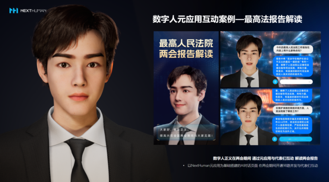 “正义”依托于NextHuman完善的AIGC引擎,可以方便快捷地在非常短的时间内零代码部署出一个高端智能交互型数字人。栩栩如生的表情动作、清晰可见的发丝纹理,结合语音合成、文本驱动、通用NLP大模型等算法和技术,“正义”实现了虚拟人从“感知”到“认知”,再到“表现”的完美融合,最后通过实时云渲染形式推送给每一位与会代表委员,以基于AGI的全自动对话与代表委员进行高效的智能交互问答。