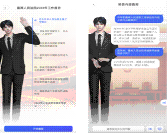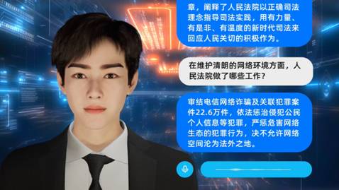 每年全国两会期间,最高人民法院工作报告受到社会高度关注。报告内容广泛、信息密度大,无论是参加全国两会的代表委员还是社会公众,想要全面了解最高人民法院的工作,都需要花费一定的精力。纯文字报告形态较为单一,阅读者容易出现背景信息不了解、难以把握重点、存在理解盲区等问题。为了便于代表委员和社会公众深入了解最高人民法院工作报告主要内容,2023年,最高人民法院新闻局结合前沿传播样态,与有关科技公司合作,利用人工智能领域最新技术,创新推出两款人机交互式对话产品——首位人工智能虚拟司法助手“正义”、首位报告解读AI数字人“林开开”,创新方式方法向全民深度解析和形象展示最高人民法院工作报告。