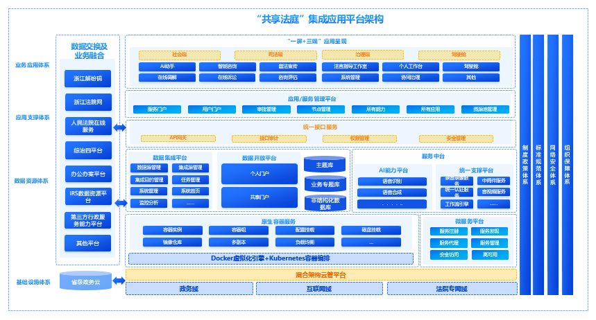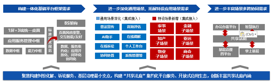 共享法庭集成应用旨在构建开放而非管控的应用生态,基础模块和子场景应用均基于统一的资源、服务、能力、规范进行开发、接入,具有功能组件相互调用、云上系统相互支撑、低成本快速接入的优势,以满足不断变化的实战需求。