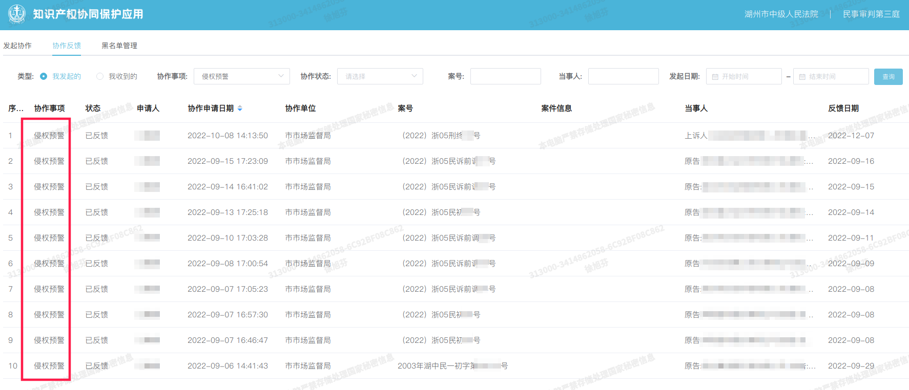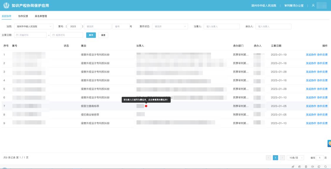 法院在知识产权案件审理中发现严重违法行为人的,依托应用向市场监管部门推送,依法纳入严重违法失信名单,并将名单嵌入办案系统,自动提醒执法办案人员,创新形成“司法建议+行政列严”工作机制。