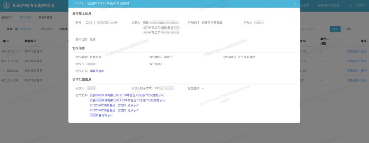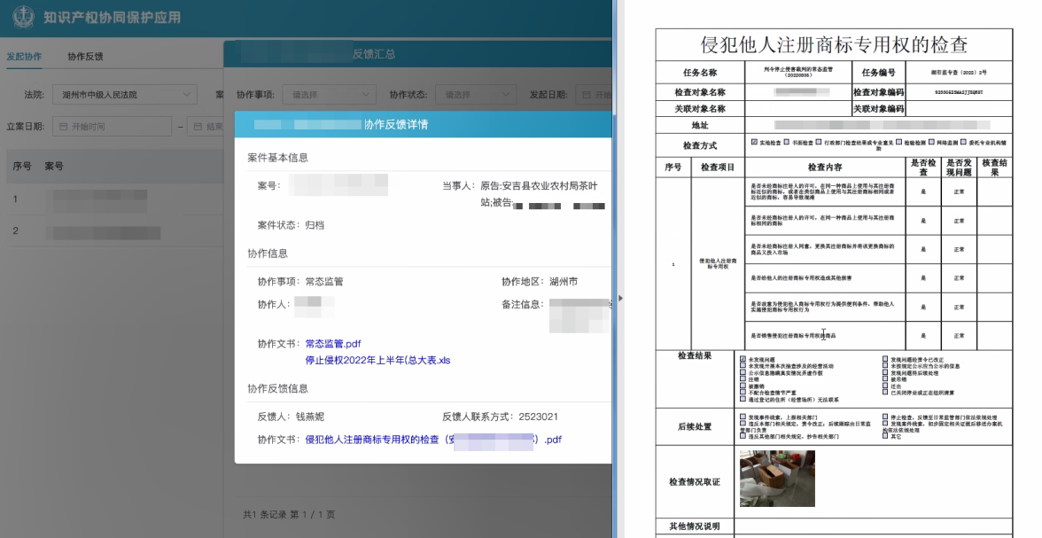 法官可在内网办案平台直接发起在线协查,向协作单位获取涉案主体行政处罚、纳税等信息,固定侵权产品数量、获利数额等事实,有效解决诉中事实查明难题,减轻权利人举证负担。其中,结构化数据通过IRS系统共享,非结构化数据通过浙政钉“法护知产”端口传输。