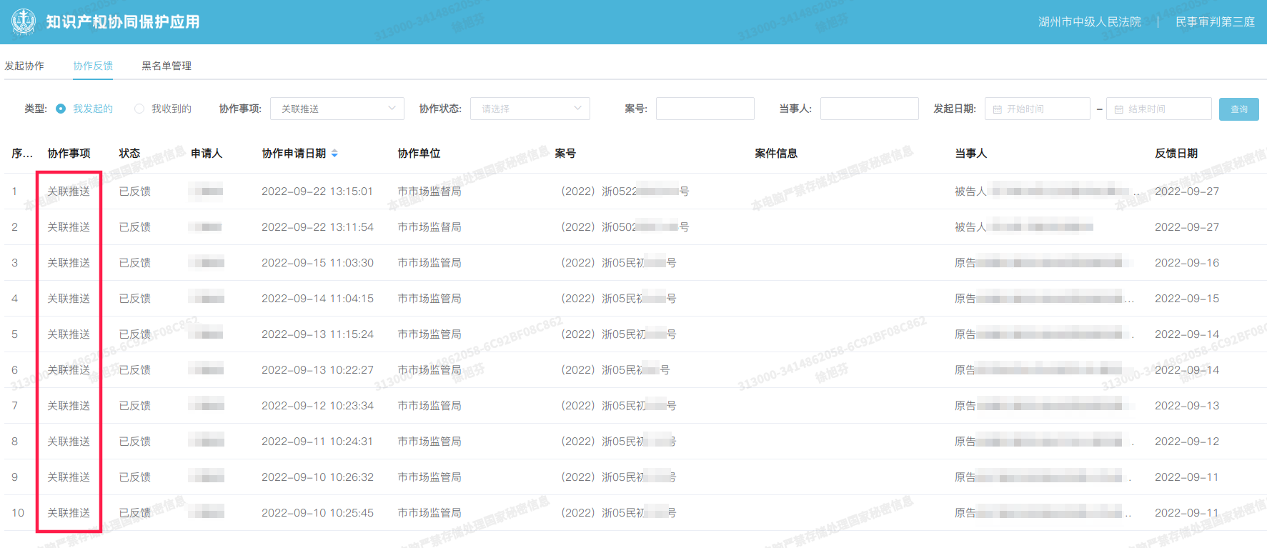 应用支持执法、司法机关在知识产权案件办理过程中,关联获取相关当事人涉行政执法、司法裁判的文书,自动推送类案裁判,为统一知识产权保护标准提供依据。