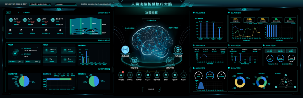 智慧执行大脑通过数据驱动、数字赋能,实现执行指挥中心数字化转型,加强执行指挥中心的实体化运行能力。搭建“可感知、可发现、可认知、可指挥”的法院智慧执行大脑平台,以平台为牵引推动法院执行办案体系全面升级,助力提升执行规范化水平,形成面向执行全流程风险预警发现、分析、处置的工作闭环,提升执行工作成效,打造全国领先的新一代智能化指挥中心。