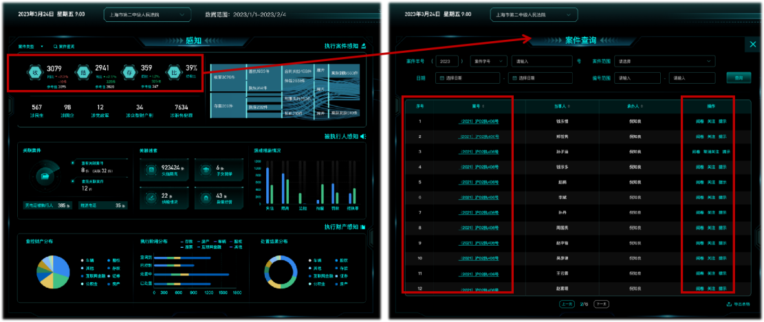 在数据监管一屏览实现全局监管,聚焦“人”、“案”、“财产”等执行要素,实现全局化的数字监管。聚焦执行关键环节,构建执行质效、执行案款、执行终本、执行信访、执行公开、执行评拍、委托执行等管理主题,实现关键环节的全局性管理。