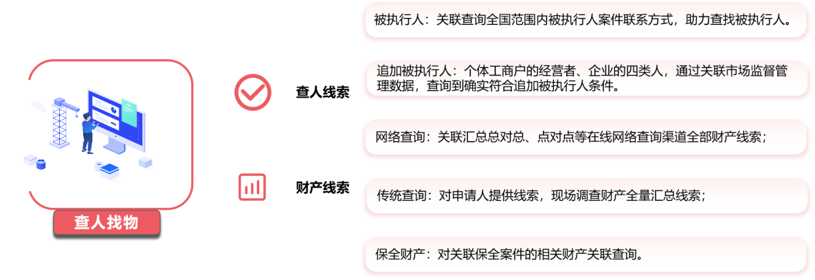 查人找物线索挖掘,通过数据分析、特征提取,自动挖掘有价值财产线索,引导线索核实与控制,为法官提供办案助力。