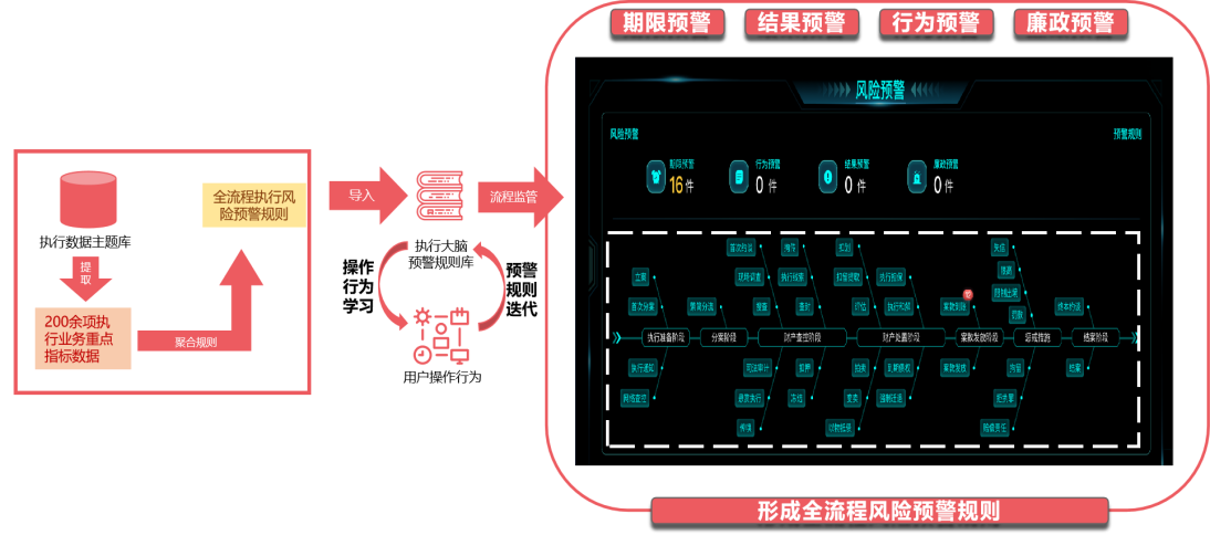 构建执行主题监管知识库,识别、分析案件指标体征,从期限预警、行为预警、结果预警、廉政预警四方面,及时发现执行全流程中的问题与风险,实现全局数字化监管。