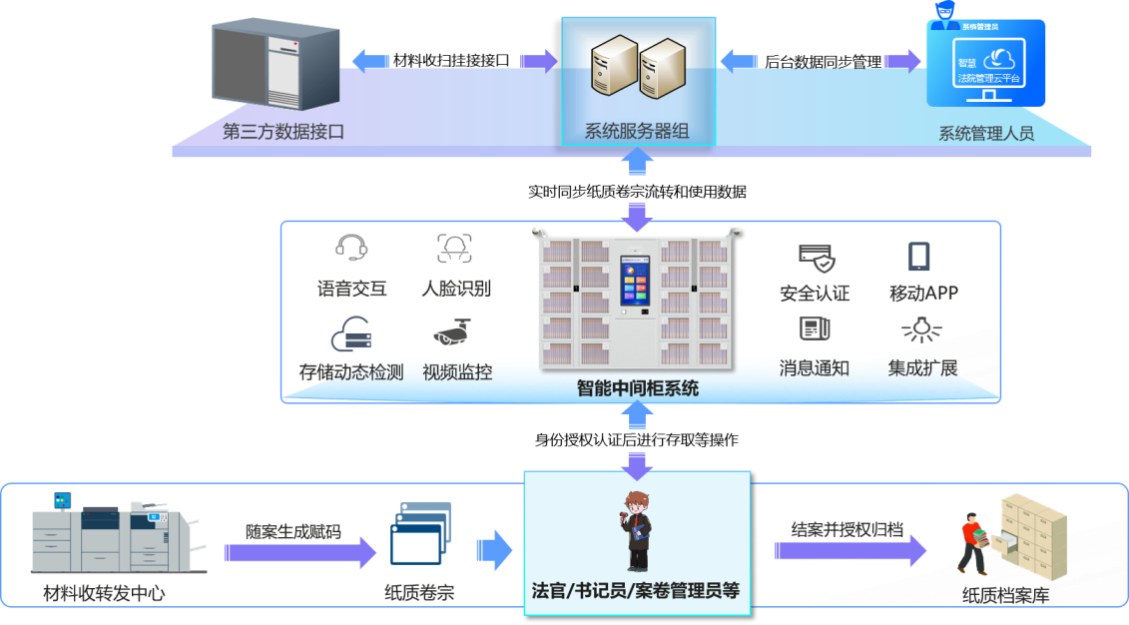 视尔卷宗材料智能流转系统是视尔公司根据最高人民法院《关于全面推进人民法院电子卷宗随案同步生成和深度应用的指导意见》精神,综合运用智慧法院建设成果研发的数字化卷宗材料流转工作站,以卷宗材料安全流转、便于查阅存放为目的,充分利用物联网技术、数控技术和人工智能技术的深度融合,实现纸质卷宗在立案后、归档前的统一存放、有序管理,可实时追踪、追溯,实现卷宗材料流转整个过程流程化、闭环化,全程通过在线操作,无缝对接法院审判流程管理系统,助力法院案卷的入库、补充、借阅、归还、归档等全流程数字化、规范化,为纸质卷宗材料提供从立案到结案归档前的统一、有序管理,有效追踪、快捷查询,确保卷宗材料在流转过程中得到安全有序的管理,为人民法院推进实质性全流程无纸化办案、提升智慧法院建设水平提供数字化支撑。