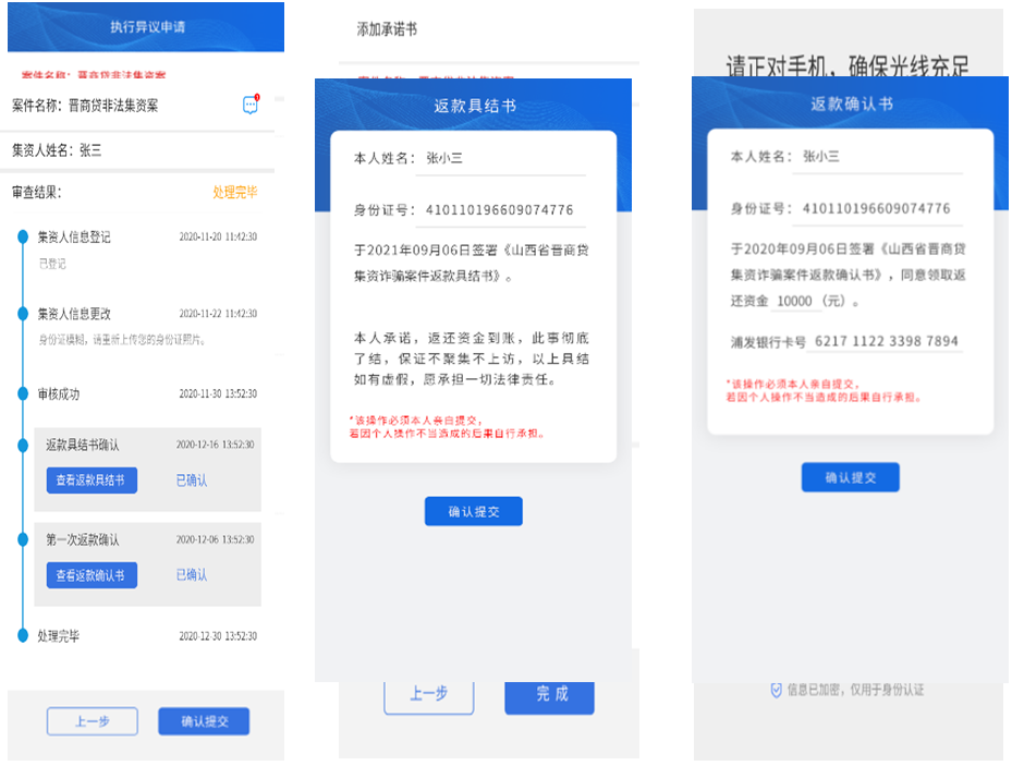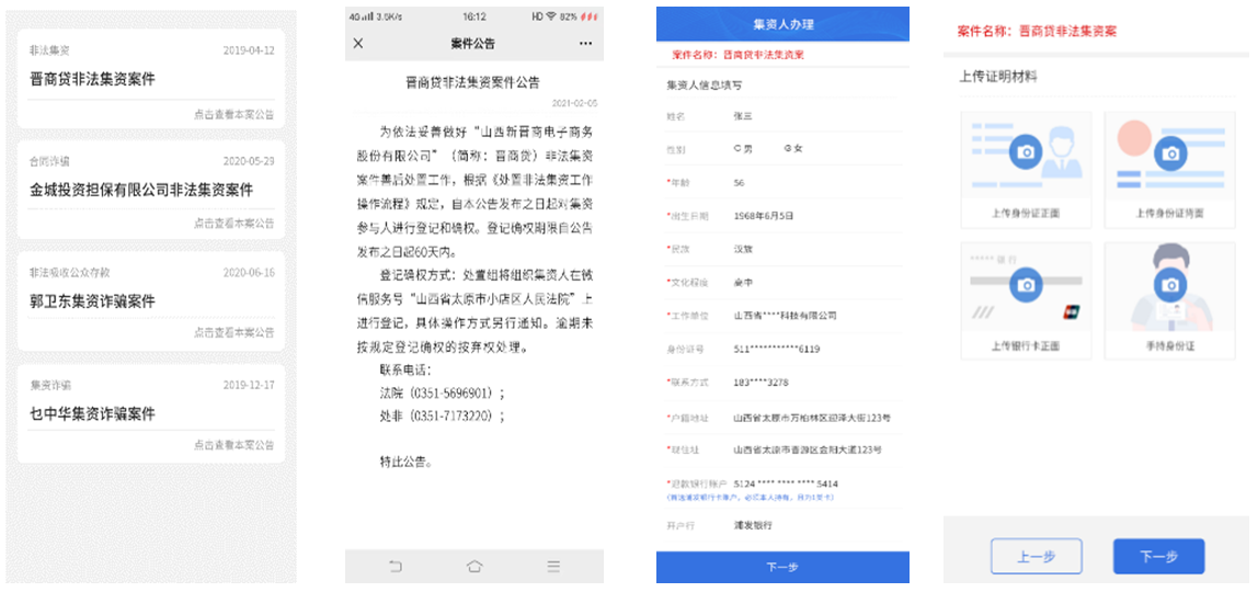 涉众型非法集资类案件登记清退平台具备身份验证、信息登记、信息审查、案件公告发布、资金清退等功能。