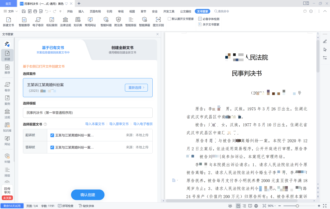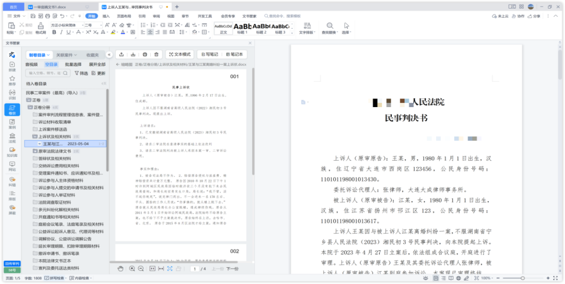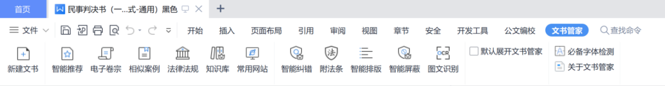 文书管家系统作为新一代的贴心化文书工具,以WPS上的插件工具形式,以大多数法官最习惯的编写文书的方式,提供了一系列辅助功能。让法官在无需学习成本、无需登录业务系统、无需考虑保存失败的稳定高效环境下,直接打开本地WPS软件即可进行裁判文书的编写。文书管家提供了编写裁判文书的全新解决方案:通过系统自动替换类案文书信息的方式,实现将案件基本信息、诉讼请求、事实理由等信息自动替换为本案信息,高效完成裁判文书绝大部分内容的自动填充。