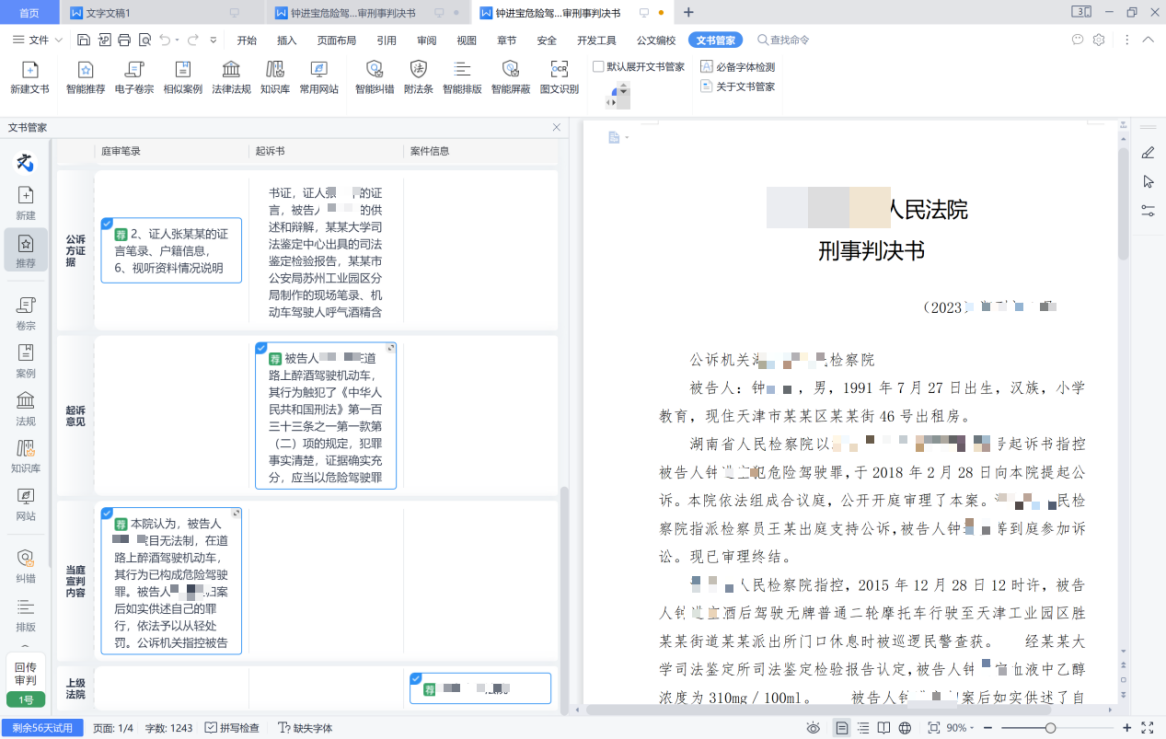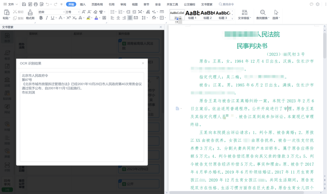 文书管家根据法官使用本地文本软件编写文书的习惯,通过自然语言处理技术、多源数据比对技术,结合案件信息及相关文书信息,按照选择的文书模板自动生成文书初稿,方便法官在此基础上进一步完善文书。在完善文书内容制作过程中,通过OCR识别技术、结合办案辅助、智检大脑等AI能力,系统还提供了OCR识别复制粘贴、查阅案件电子卷宗、相似案例推荐、法律法规智能推荐、文书排版等功能辅助法官进行案件裁判,进而完成裁判文书的编写。除此之外,系统支持法官将公开的优秀文书、自己以往的结案文书进行统一管理,方便法官以此为文书蓝本快速高效的生成文书初稿。
