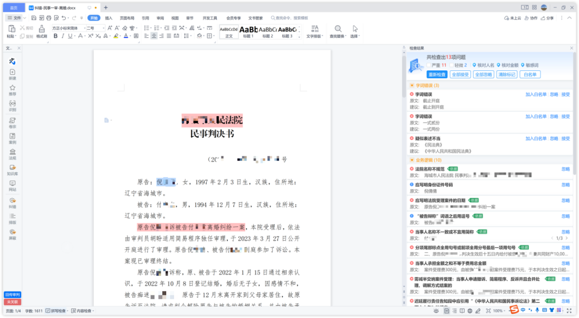 智能纠错,对文书格式、文书内容与案件信息一致性、业务规则、字词规则等内容智能识别、多源比对、智能纠错,提供文书内容与纠错结果双向定位的交互,快速核对;提供纠错依据,让法官有据可改;人名、金额、敏感词集中展示,专项核对,极大提升文书内容质量。