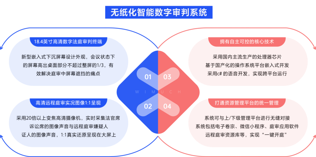 数字法庭建设有助于通过审判公开、司法宣传、文书公开查询以及为人民陪审员参与案件审理提供了重要的技术平台。Wimuch研发的无纸化智能数字审判系统,为智慧数字法庭开庭工作问题提供了全方位的解决方案。