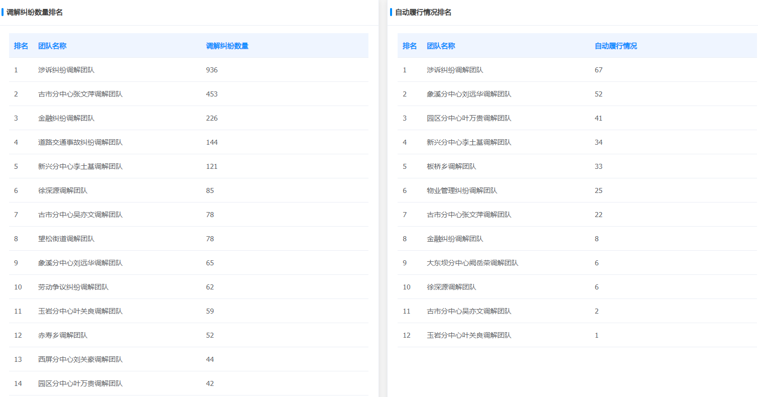 与线上系统建设同步进行的,还有矛调体系重塑。为更好推动矛盾纠纷实质性化解,松阳县由县委政法委牵头,法院、公安局、司法局等单位协同,建设调解团队匹配“松阳基层解纷在线”。这里面包括涵盖金融、家事、道交等多个专业领域的专业调解团队,也包括涵盖全县各个乡镇的调解团队。每个调解团队配备调解助理解决文字输入、信息报送等辅助工作;配备共享法官与共享警官,提升人民调解的专业性与权威性。同时,将调解团队工作业绩实时展示在“松阳解纷在线”系统,通过“比学赶帮超”激发调解团队工作的内生动力。此外,将系统中的工作业绩与考核挂钩,以真正公开透明的方式实现“多劳多得”的工作导向。