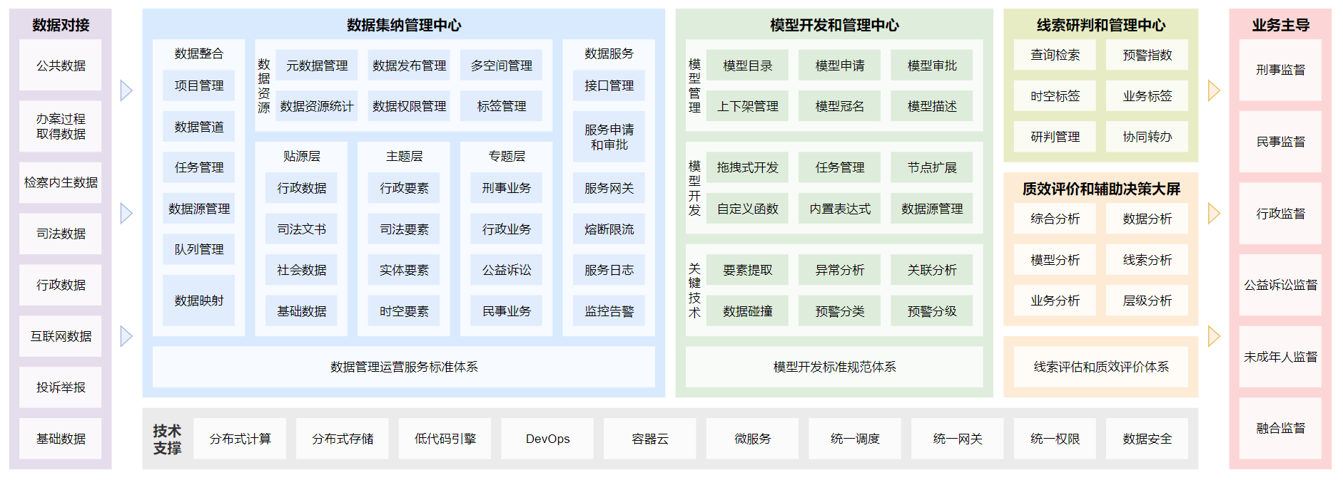 “模型库”包含模型开发必需的数据汇聚、数据存储、数据管理、数据服务、数据处理编排等数据治理功能,配套大数据法律监督数据治理体系,对接司法数据、行政数据、互联网数据、公共基础数据等多种数据源,实现一次对接、一体清洗、一个标准、多模型共用的效果。