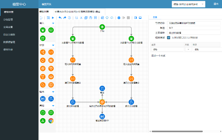 基于拖拽式可配置的低代码数据开发技术,对异常分析、数据碰撞、要素提取、关联分析等技术进行可视化、组件化封装。通过拖拽和简单配置,即可完成标准的模型开发工作,帮助业务人员和模型开发者简化流程、快速迭代、高效建模。