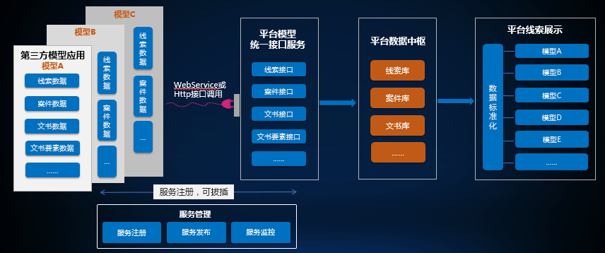 方案一:平台提供第三方模型应用服务注册接入方式,为第三方模型提供统一接口服务,第三方模型应用将线索及关联数据通过服务接口推送至平台,供平台进行线索的统一展示及研判管理。