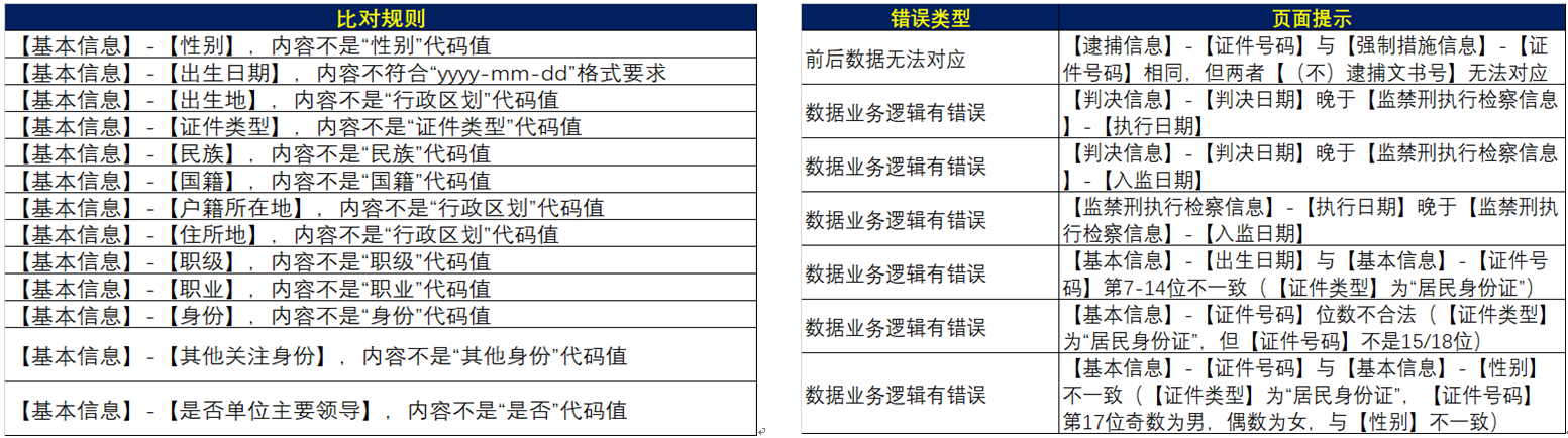 (2)提高了案卡的数据质量。执行机关报送的信息以Excel文件形式提交,上传业务系统2.0时,系统虽然提示“校验成功,无异常数据”,但实际上存在很多错误的填写,业务系统都无法发现。平台预设数据质量检查业务规则,能够检查到的错误有:32个必填数据项未填写、81个数据填录内容不符合规范、15组数据前后填写不一致、9类业务逻辑错误(如判决日期晚于执行日期等)、6类不符合导入模板要求的错误。