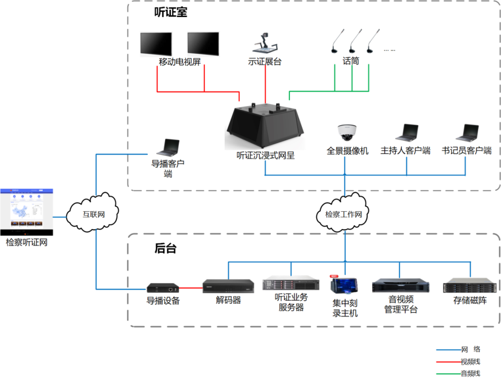 听证系统主要包括:1.听证沉浸式网呈,集成了摄像机、显示屏、刻录机、视频矩阵、音频矩阵、编解码模块、中控模块、扩声设备、画面分割器,本身可以采集听证四面席位的视频图像,并向四面席位播放听证画面和声音。同时,能够接入听证室中的全景摄像机、话筒、移动电视屏、实物展台等设备,主要负责听证画面合成、混音播放、语音激励、证据展示、中控控制、同步录音录像、光盘刻录等功能。1080P高清全景摄像机,用于听证室现场全景图像的采集,传输到听证沉浸式网呈后,与各个席位图像进行高清多画面合成,并进行同步录音录像和光盘刻录。在听证室里各个席位配置定向话筒,采集检察官(主持人)、听证人员、其他当事人的发言并汇聚到听证沉浸式网呈进行混音,并且由听证沉浸式网呈进行录音。话筒采集的声音可以联动摄像机实现语音激励功能。听证室现场笔录与示证设备包括实物展台、电脑等,由VGA或HDMI接口接入到听证沉浸式网呈当中,通过听证沉浸式网呈的矩阵切换功能,实现笔录与示证内容的现场展示,并且可以通过听证沉浸式网呈的编码模块,将笔录和证据内容进行数字化处理,叠加到合成画面。听证室现场配置书记员电脑,主要功能是录像控制、刻录控制、书记员笔录和证据展示切换。另可以配置主持人电脑,用于查看听证提纲和案件资料;配置导播电脑,用于控制管理公开直播。公开听证业务服务器安装有公开听证业务管理系统软件,提供用户一个统一的登录界面,可以实现案件管理、排期管理、本地听证、远程听证、播控管理(听证直播)、系统管理与配置等功能。该系统通过开发可以与数据分析平台对接,向数据分析平台上报听证业务数据等。音视频管理平台由同录主机接入到平台进行统一管理,利用平台的码流转发能力,可以实现检察工作网内的音视频资料共享和存储。存储磁阵可以将听证的音视频资料集中存储与管理。根据存储资料数量、周期,可以配置不同容量的存储阵列。集中刻录主机包含光盘打印刻录机,听证光盘集中刻录和封面打印。解码器用于公开听证现场画面的解码。通过高清解码设备实现HDMI模拟信号的转换输出。实现从检察工作网至直播互联网的信号跨网。导播设备直接与解码器模拟信号对接,进行编码后以RTMP协议推流的方式推送至高检院云端直播服务器中,进行互联网公开直播。