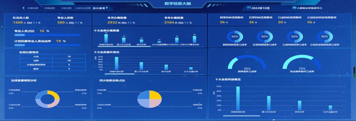 利用大屏可视化技术,实现监督成效和实时状态一体化展示、办案情况综合展示、业务协同综合展示和数据安全态势等情况的可视化展示,为检察业务工作提供决策辅助,形成数字检察的研判、指挥大脑。