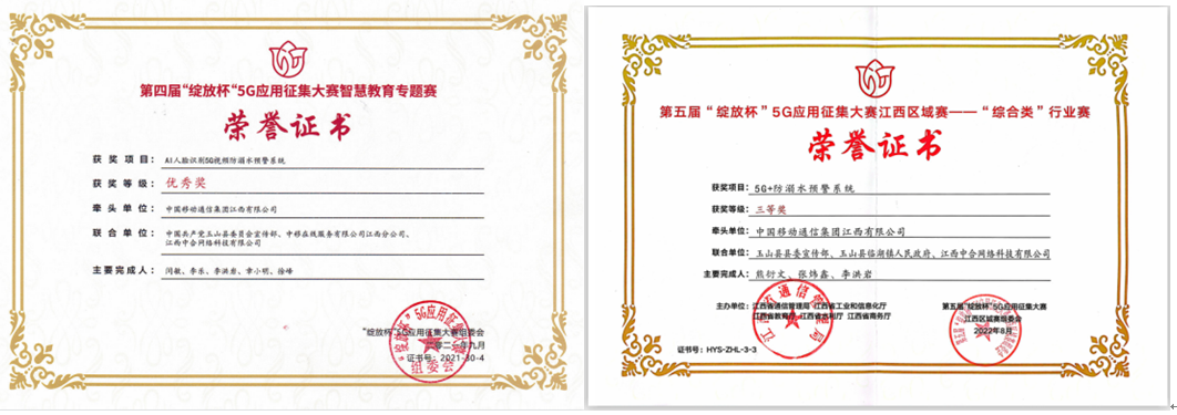 该项技术获得国家知识版权局颁发发明专利,并相继荣获“第四届‘绽放杯’5G应用征集大赛智慧教育专题赛”优秀奖以及“第五届‘绽放杯’5G应用征集大赛江西区域赛--“综合类”行业赛”三等奖,获得“外观设计专利证书”以及“中华人民共和国国家版权局计算机软件著作权登记证书”13项防溺水软件专利证书等。防溺水预警系统上市后得到社会各界一致好评,并得到新华社、江西日报等主流媒体高度关注并多次专题报道。