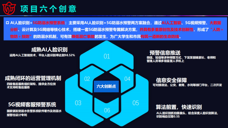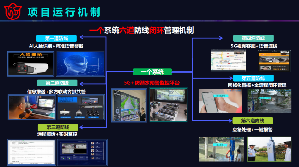 新推出的“5G+防溺水告警系统3.0”具有六道防线、六大创新点、七大功能,通过录入学生的人脸信息,结合危险水域边智能摄像头AI人脸识别手段,结合专人值守指挥中心的形式,用“技防+人防”,全面筑牢防溺水安全防线。在孩子靠近时可以立即语音警告,在学生入水前及时通知到学生家长、后台值班人员和巡逻队,最大程度上避免事故发生。