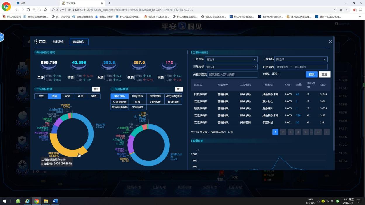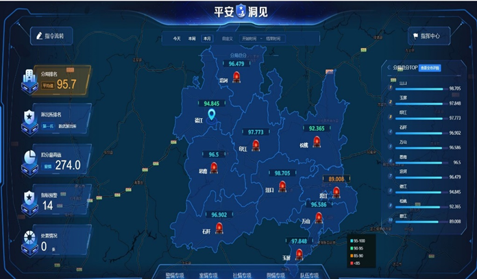 系统通过大数据技术对警务数据建模分析,以区县公安局和派出所为单位进行模型评估和扣分计算,自动生成各分局、派出所的平安积分,以最直观的评分方式展现全市10个区县和178个派出所的安全形势。同时,对影响安全的风险情况进行深入研判和挖掘,建立模型,实时掌握可能导致风险发生的因素、动态和趋势,有效指导基层开展针对性的防控工作。