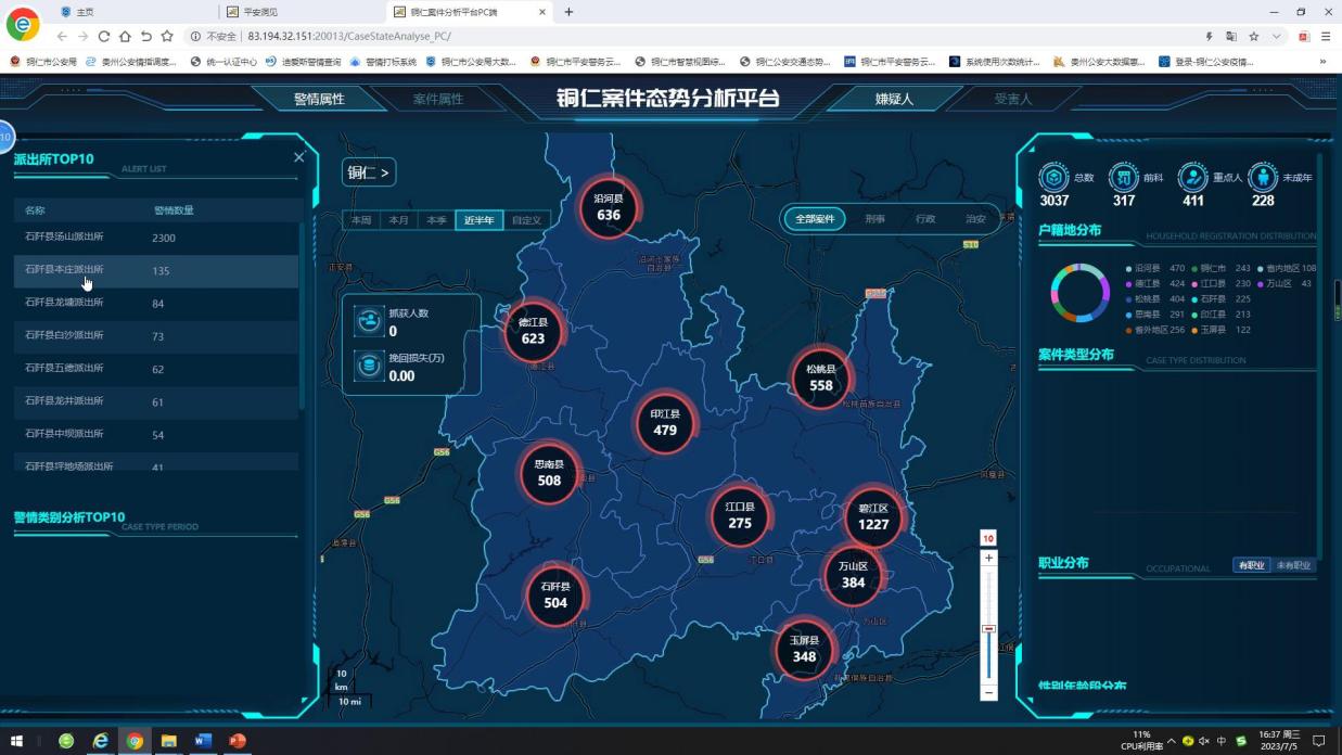 采用大数据环境的分布式HADOOP集群,依托大数据可视化技术,以“警情、案情、社情、舆情”四个界面等20余个模型,直观展示数据分析结果,精准掌握社会治安整体态势,为社会治理提供决策参考。