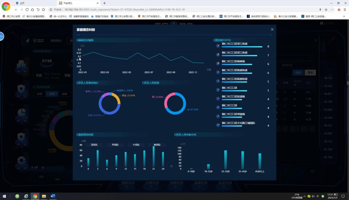 系统全面整合分析警情、案情、舆情、社情数据,建立了包含4个一级指标、27个二级指标、170个三级指标的平安指数体系以及警情特征、案情预警、社情风险、舆情热度等20余个主题模型,以指数化、可视化方式多维度展现社会治理风险。通过“内外流转”机制,属于公安职责的,通过系统将风险预警指令推送给市县两级公安机关,指导打防管控;不属于或不完全属于公安职责的,通过“一分析三报告”等方式,向同级党委政府、政法综治部门报告,提请市平安办开展重点整治、挂牌整治,充分压实地方党委政府或行业主管部门的责任。