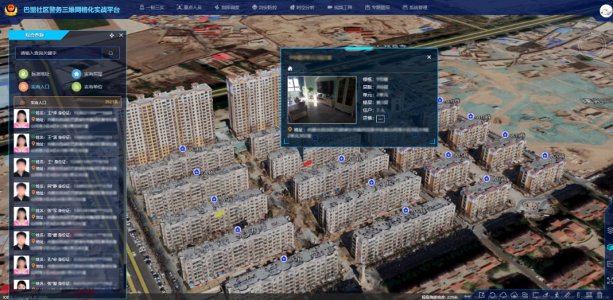 通过输入姓名、身份证号、辖区等条件,可查询人员信息,以及居住的地址信息,同时通过点击居住地址信息,可直接在三维地图中定位所居住的楼栋甚至房屋信息,查看该房屋的详细信息,真正实现以人查房。